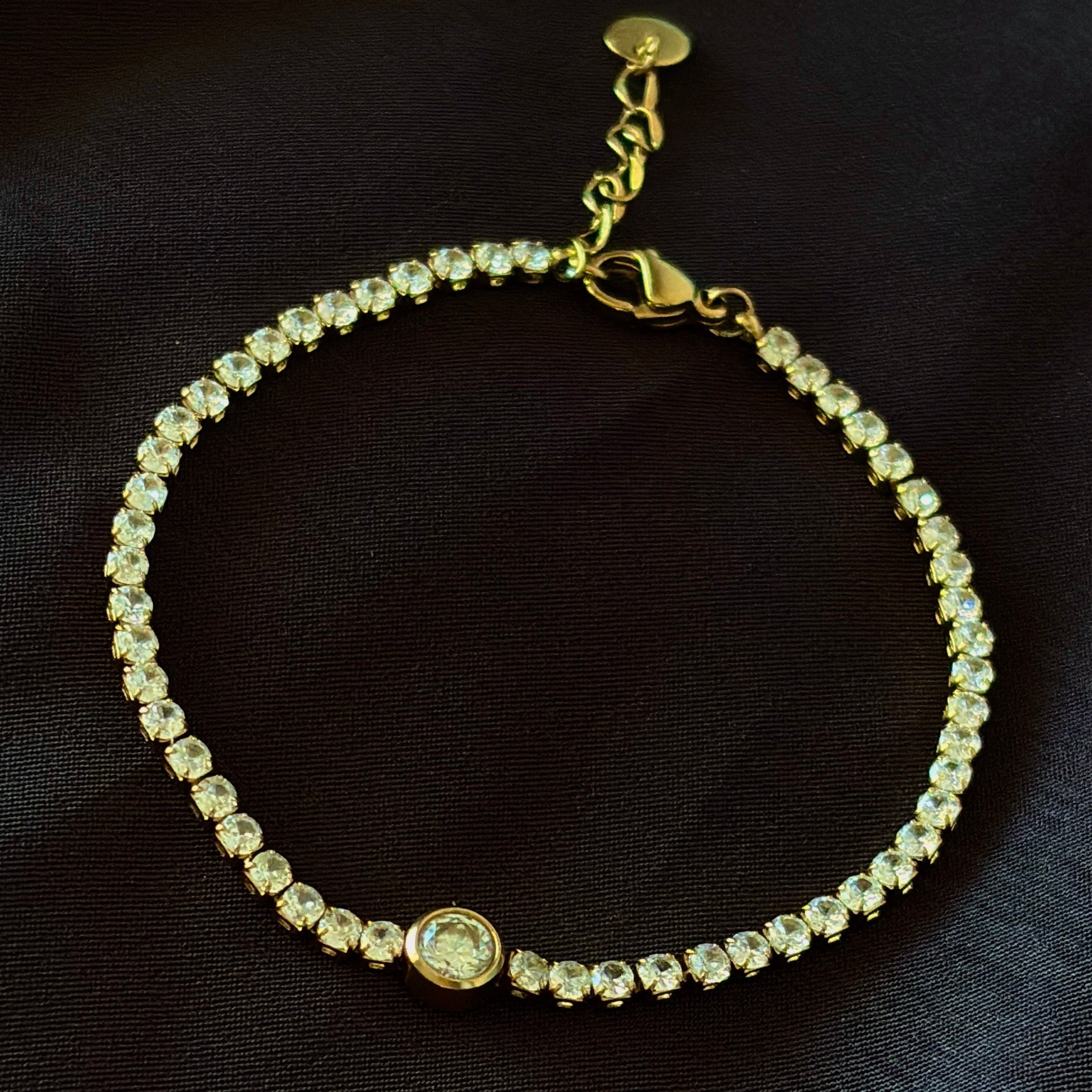A classic tennis bracelet featuring a slightly larger center crystal that catches the light beautifully. Designed for everyday wear, it is lightweight and comfortable. At the same time, its elegant simplicity makes it the perfect finishing touch for a night out or any special occasion.